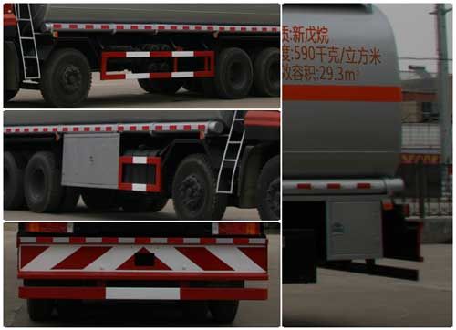 | 整車說(shuō)明: | 罐體有效容積:29.3立方米,介質(zhì):新戊烷,類項(xiàng)號(hào):3,密度:590千克/立方米,罐體尺寸:長(zhǎng)9000毫米,長(zhǎng)軸2450毫米,短軸1690毫米.隨底盤選裝駕駛室,選裝罐頂護(hù)欄和尾部爬梯.側(cè)、后防護(hù)裝置材料材質(zhì):Q235B,側(cè)、后防護(hù)均用螺栓連接,后部防護(hù)裝置斷面尺寸(寬×高)60×100(mm),后部防護(hù)離地高度:540mm.安裝具有衛(wèi)星定位功能的行駛記錄儀,安裝前輪盤式制動(dòng)器,僅采用底盤子午線輪胎.ABS生產(chǎn)廠家:東風(fēng)電子科技股份有限公司制動(dòng)系統(tǒng)公司;型號(hào):3631010-C2000 | ||