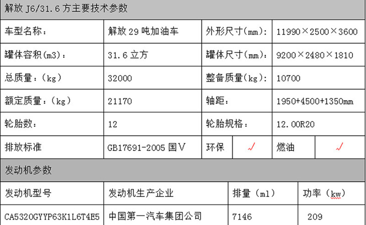 解放J6M高頂雙臥豪華駕駛室,大柴285馬力國五發(fā)動機(FCRI+SCR氣驅、雙腔空壓機),解放九檔變速箱(法蘭輸出取力器),440后橋,12R22.5型(鋁合金輪輞),自動空調、300L鋁油箱、鐵保險杠、高效單空濾、鋁散熱器、駕駛室后兩點空氣懸置、電動液壓舉升裝置、懸架為前少/后氣囊、前后盤式制動器、排氣尾管前置、車輛限速裝置、排氣火花熄滅器、整車配備靜電拖地帶2根、150Ah蓄電池、前下防護裝置。